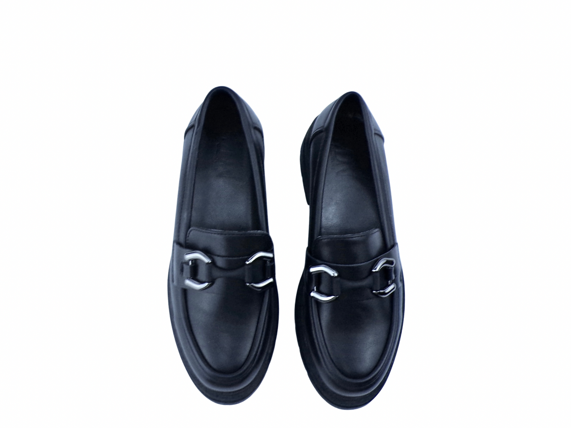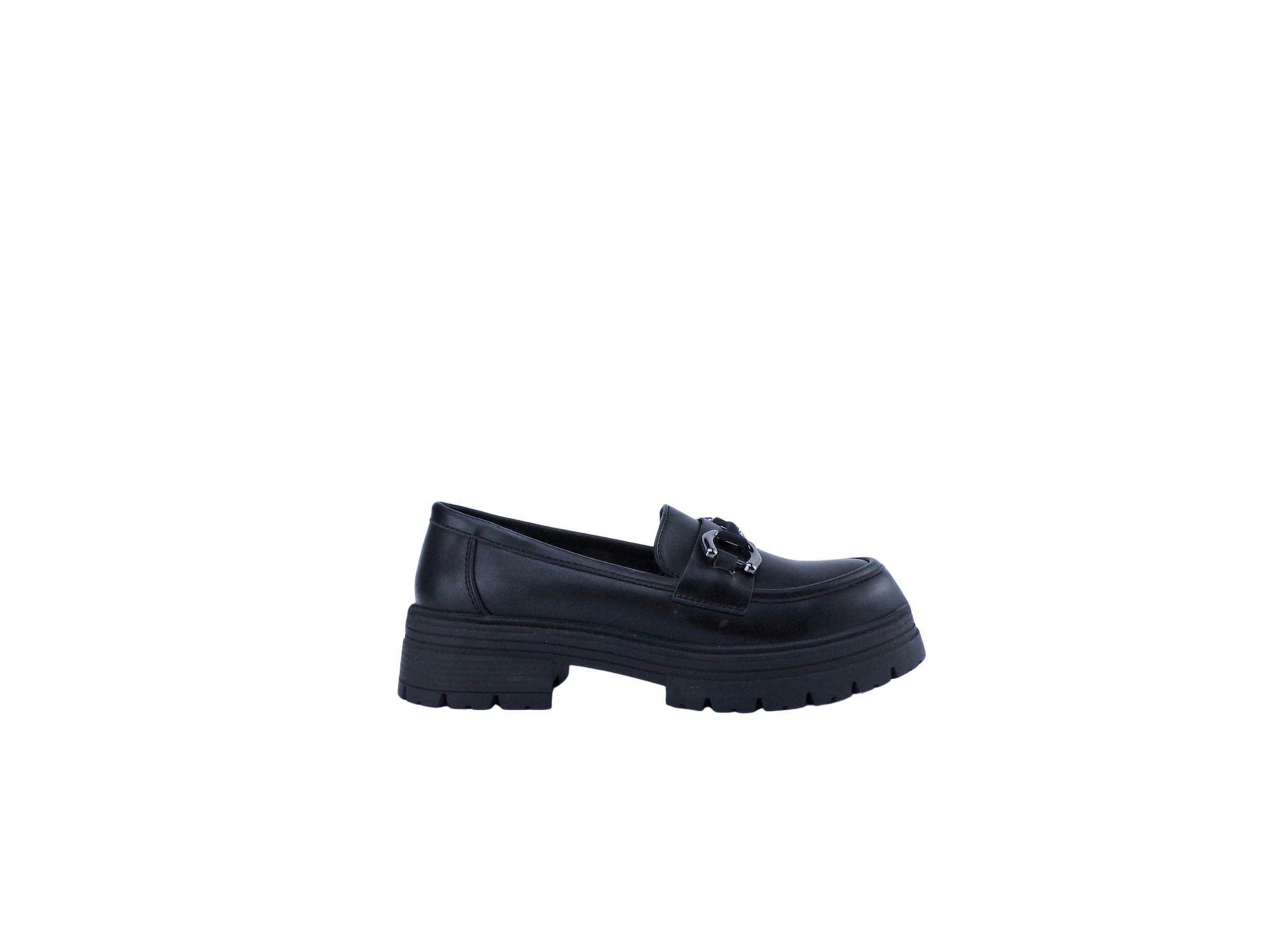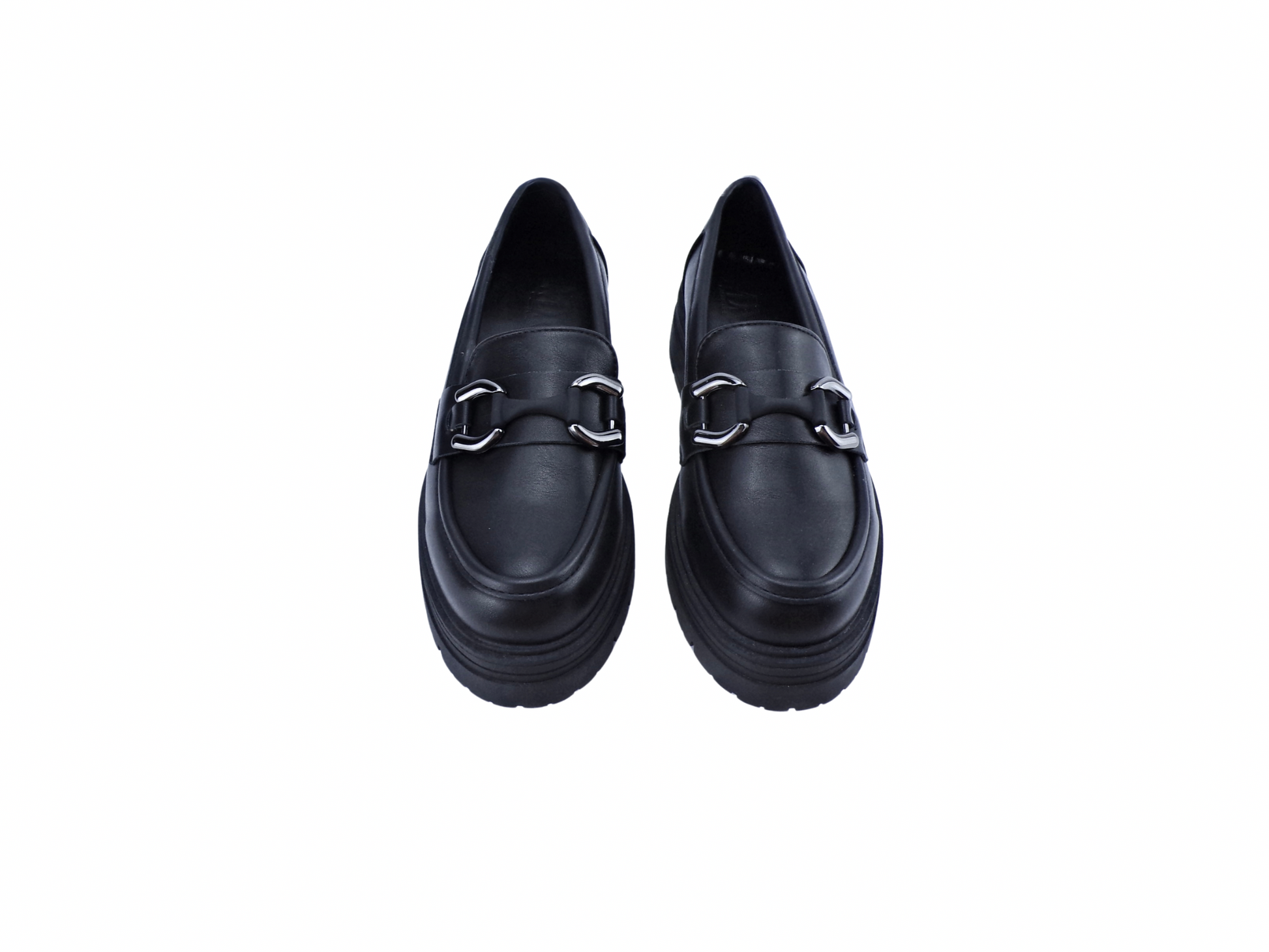 Iris, il mocassino realizzato in eco pelle con effetto vernice, questo mocassino è dotato di un morsetto quadrato in strass che aggiunge un tocco di brillantezza. Con una suola alta di 35 mm, ti garantisce comfort e stile tutto il giorno.