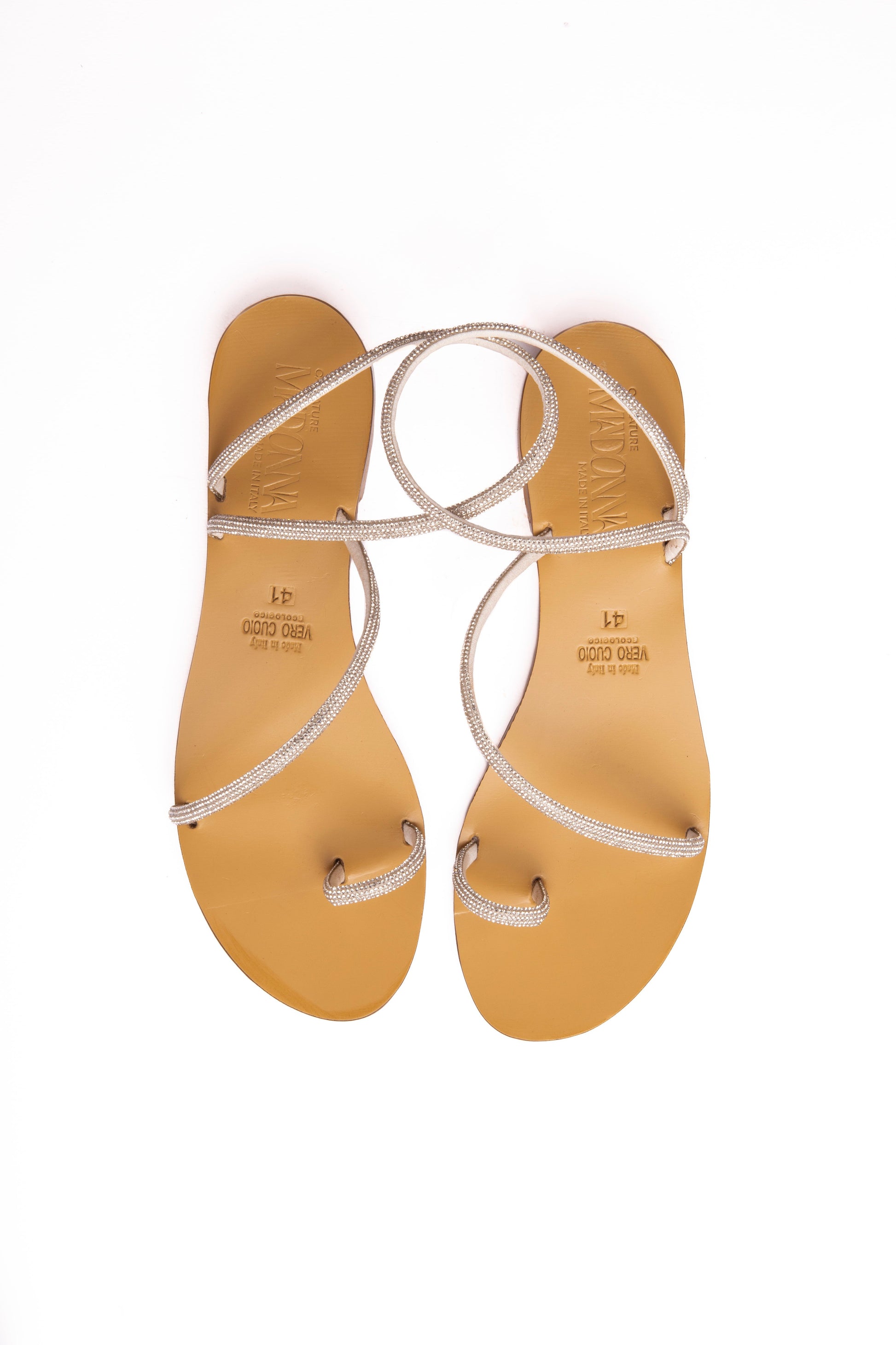 Sandalo artigianale "Ischia" realizzato con maestria italiana. La suola e il sottopiede in vero cuoio ecologico offrono comfort duraturo, mentre il mignon brillantinato esalta l'eleganza del design. Un accessorio raffinato che unisce tradizione calzaturiera e stile contemporaneo , perfetto per le calde giornate estive.