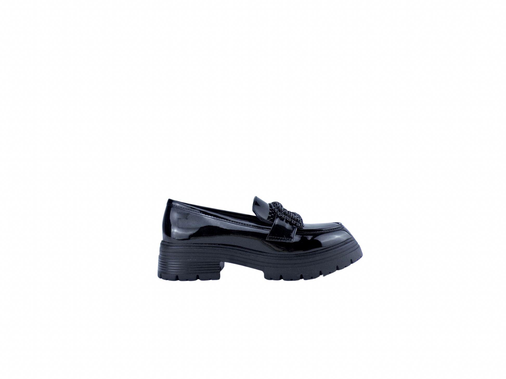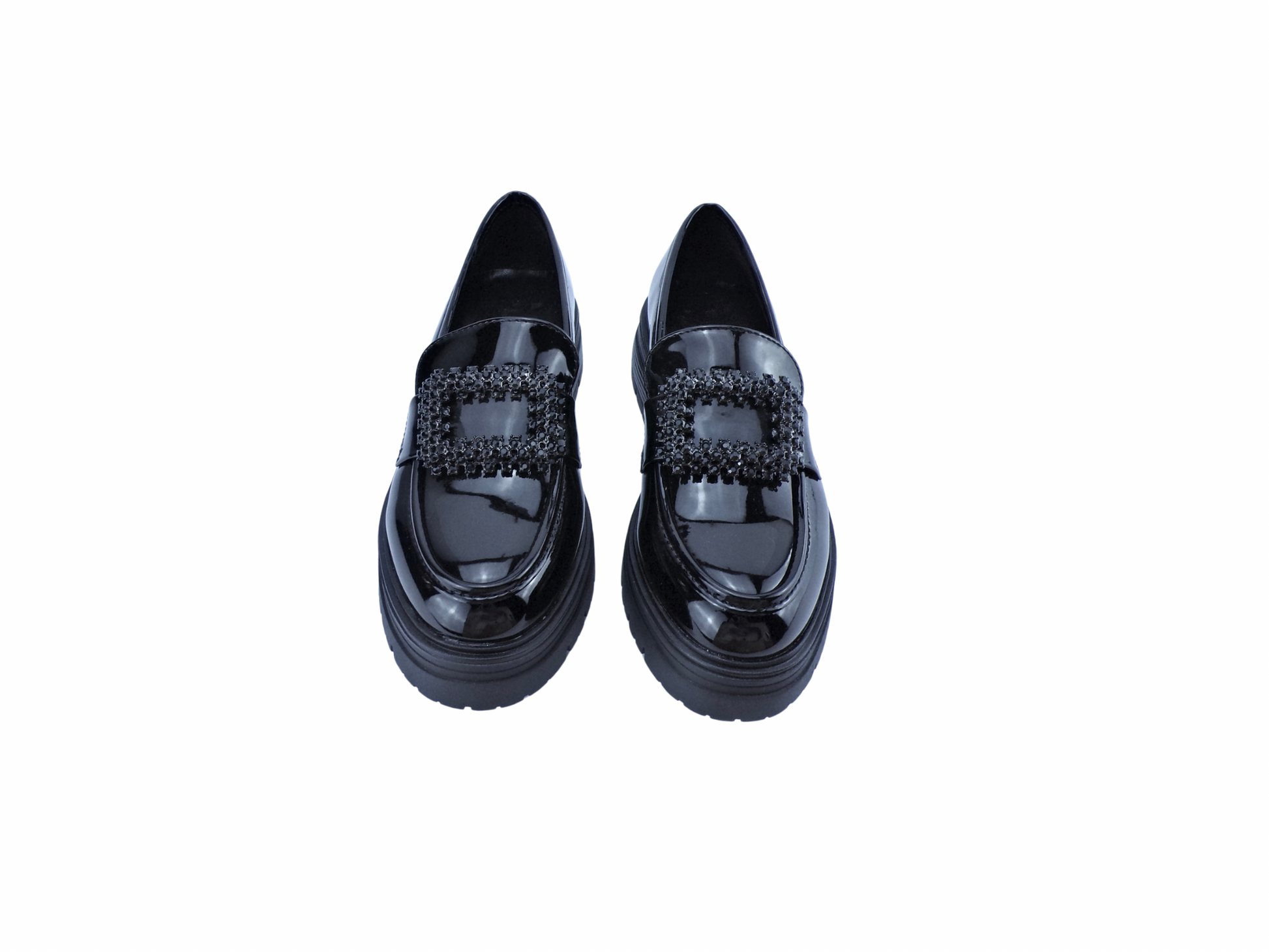 Iris, il mocassino realizzato in eco pelle con effetto vernice, questo mocassino è dotato di un morsetto quadrato in strass che aggiunge un tocco di brillantezza. Con una suola alta di 35 mm, ti garantisce comfort e stile tutto il giorno.