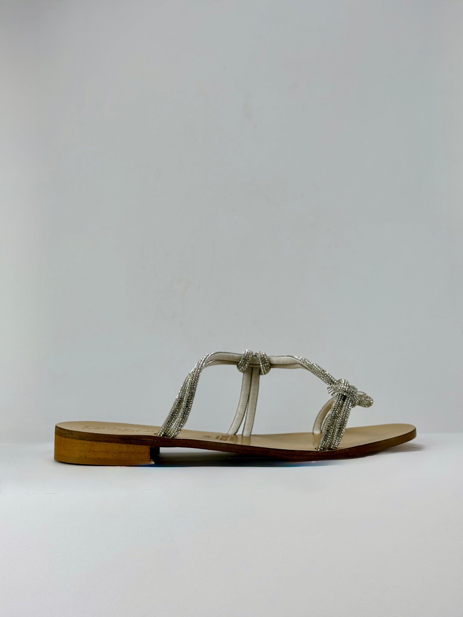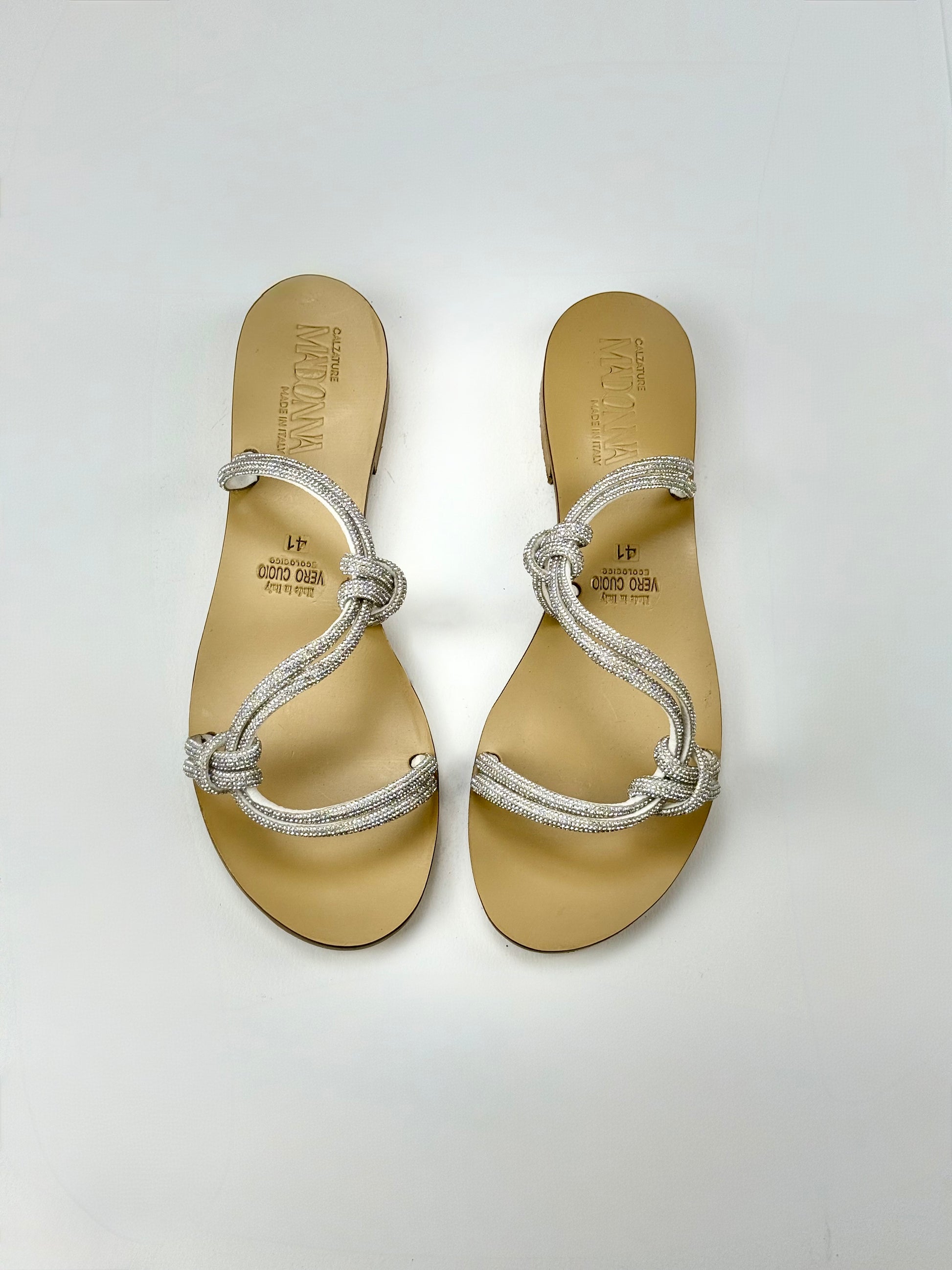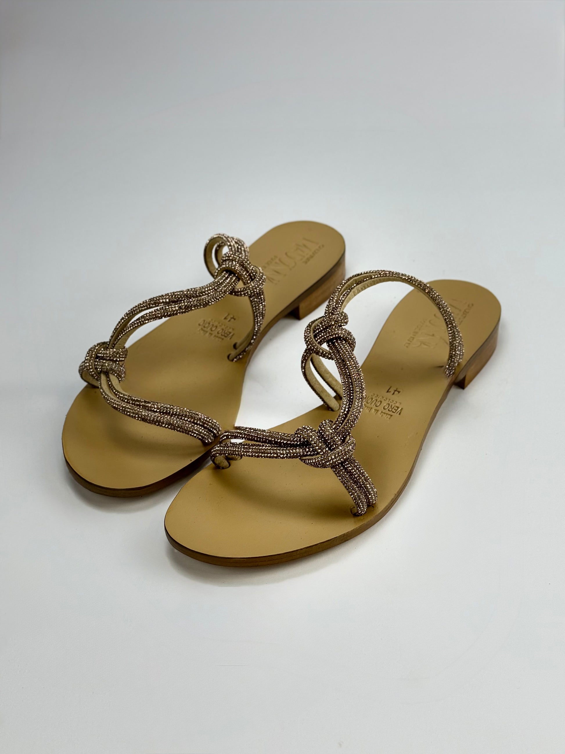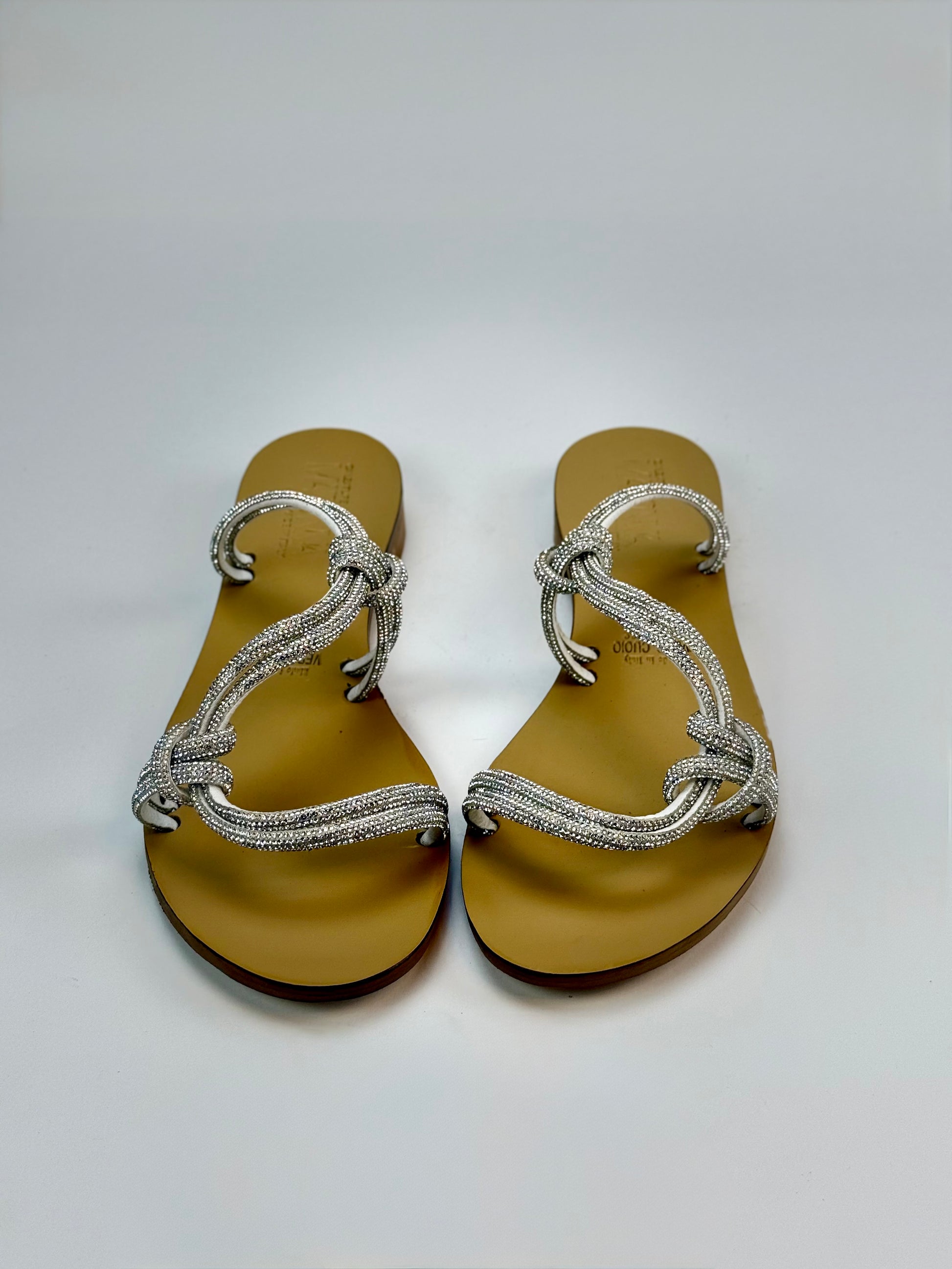 "Elegante sandalo artigianale Pozzuoli in tubolare brillantinato intrecciato. Realizzato con vero cuoio ecologico, garantisce comodità e made in Italy. Un prodotto bello e di alta qualità per aggiungere eleganza al tuo stile."